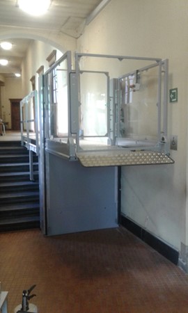 Mittels einer Metallkonstruktion wurde die Treppe mit einem vertikalen Behindertenaufzug überbrückt.
