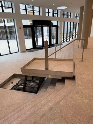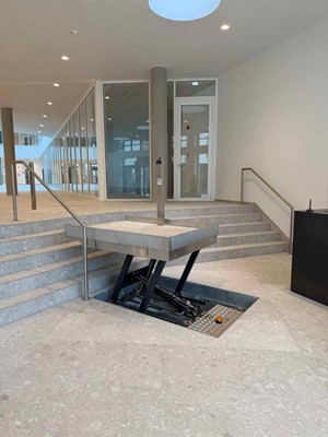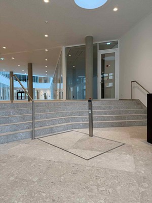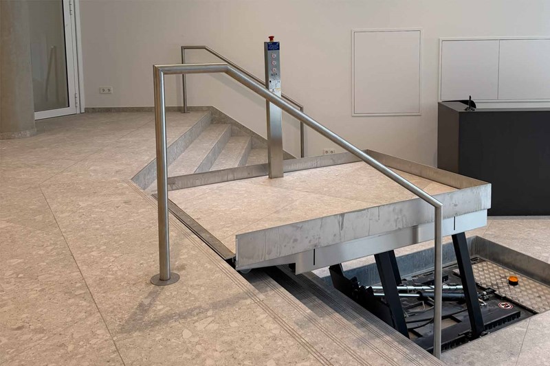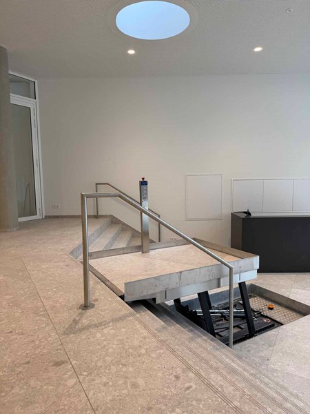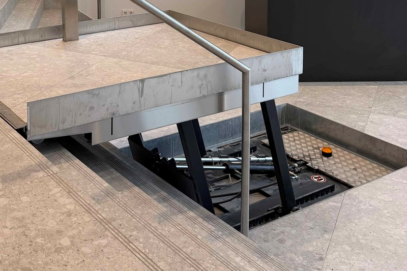 De Hydrolift, traplift/rolstoellift, werd compact geïntegreerd in het gebouw, met ingewerkte tegels, een hoogwaardige inox-afwerking en een strak design zonder zichtbare schroeven. Zo combineert dit project optimale toegankelijkheid met een discrete en elegante uitstraling.